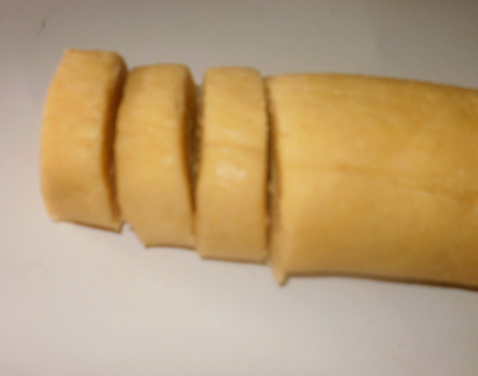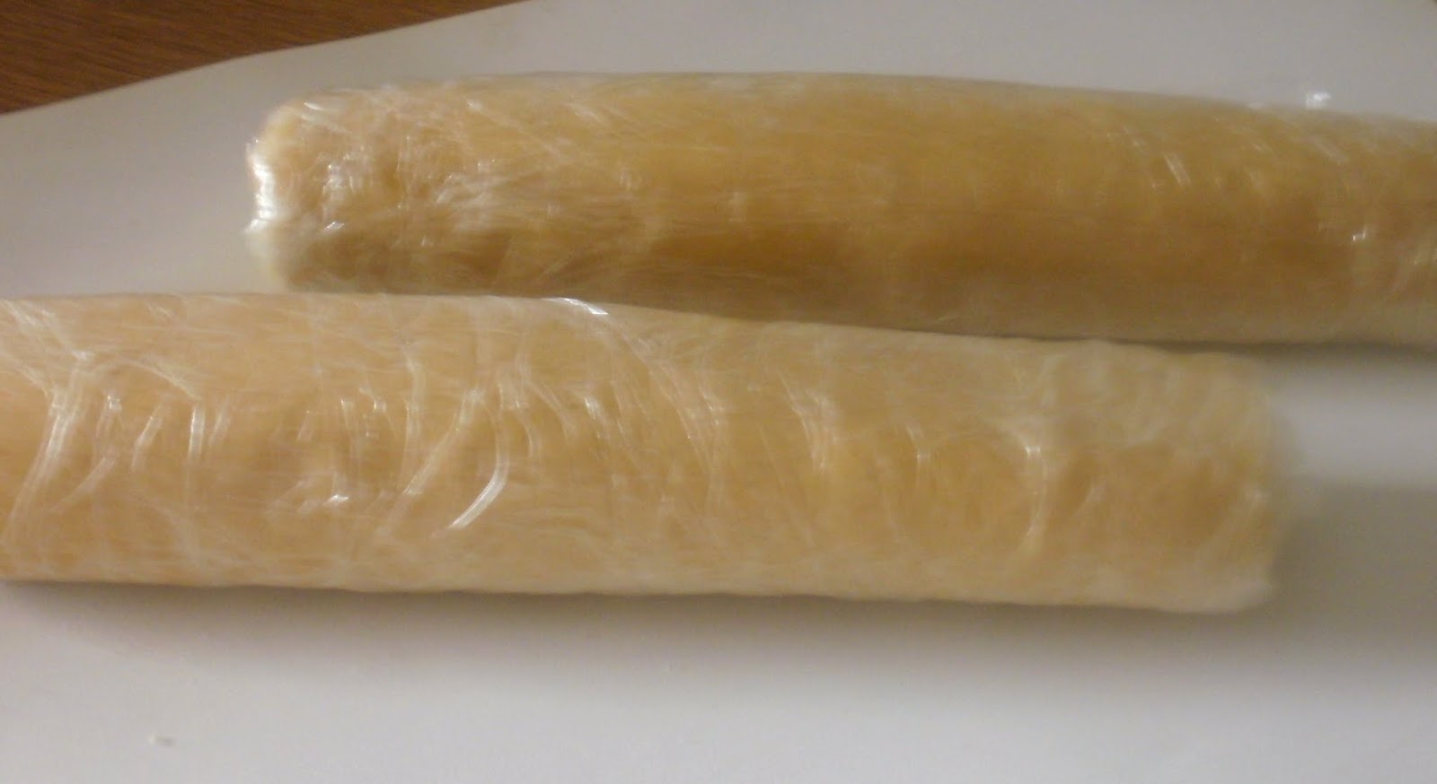 - Χωρίζουμε τη ζύμη στη μέση, τη βαζουμε πάνω σε πλαστική μεμβράνη και τη πλάθουμε, σχηματίζοντας 2 μπαστούνια 4 εκ. διάμετρο.Το ξαναβάζουμε στο ψυγείο για 2 ώρες τουλάχιστον,