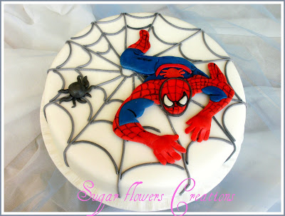 Για το στολισμό , λευκή ζαχαρόπαστα στολισμένη με φιγούρα Spiderman και αράχνη επίσης απο ζαχαρόπαστα.