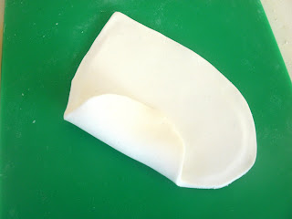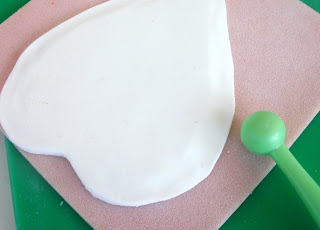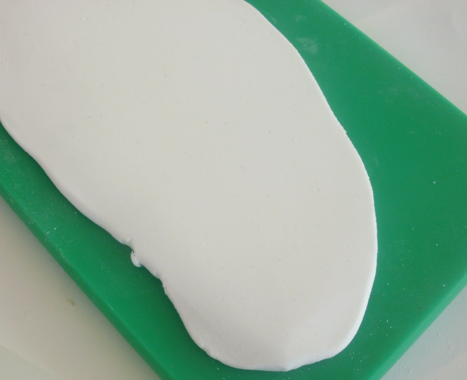5) Πασπαλίζουμε με άχνη την επιφάνεια ή το μπάγκο εργασίας μας. Ανοίγουμε με το πλάστη λίγη ζαχαρόπαστα, σε φύλλο πάχους 2-3 χιλ