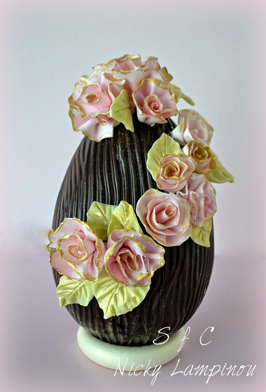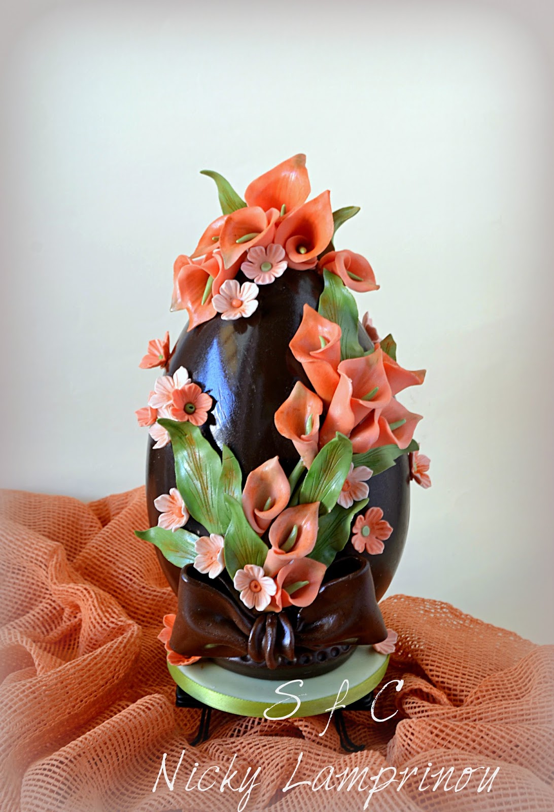 Μεγάλο σοκολατένιο αυγό διακοσμημένο με φύλλα και λουλούδια ράφλες