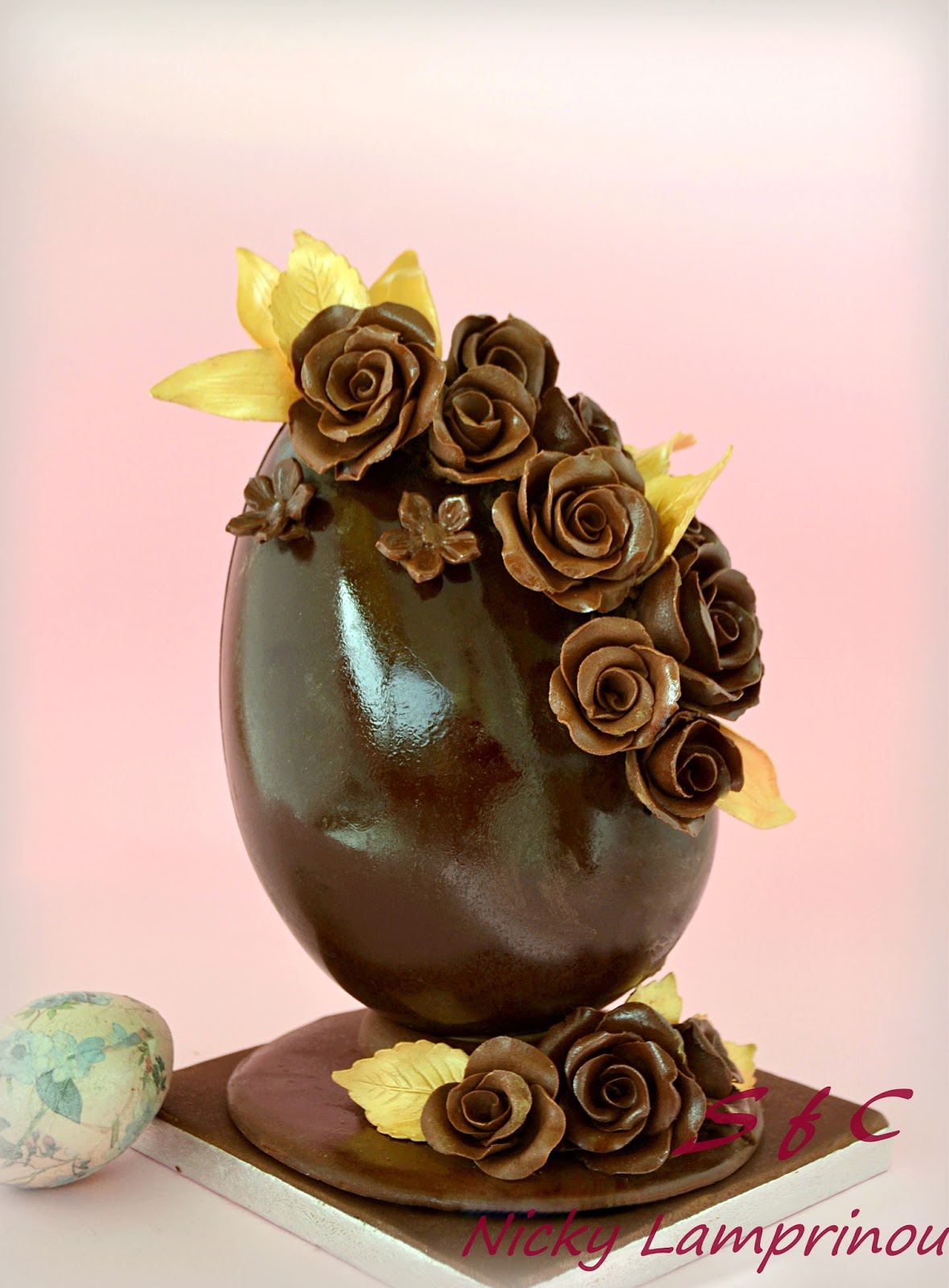 Αυγό μαύρης σοκολάτας στολισμένο με σοκολατένια τριαντάφυλλα και φύλλα χρυσά