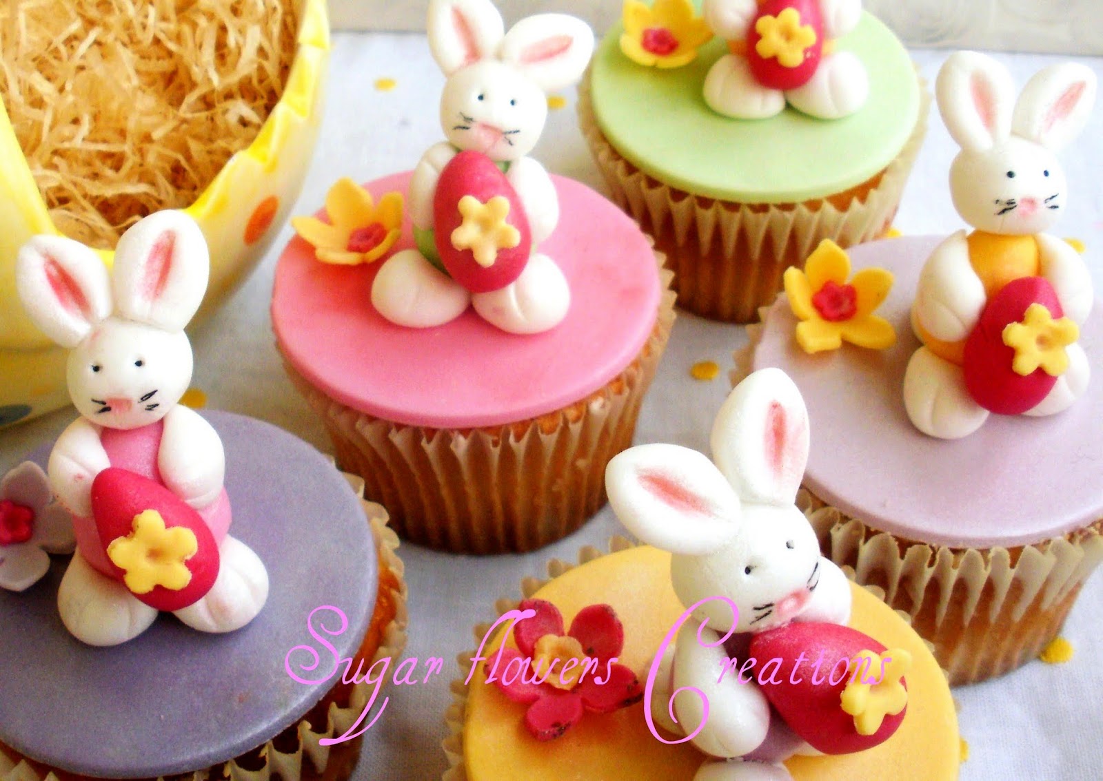 Cup cakes με λαγουδάκια να κρατάνε κόκκινα αυγά. Ολα φτιαγμένα απο ζαχαρόπαστα