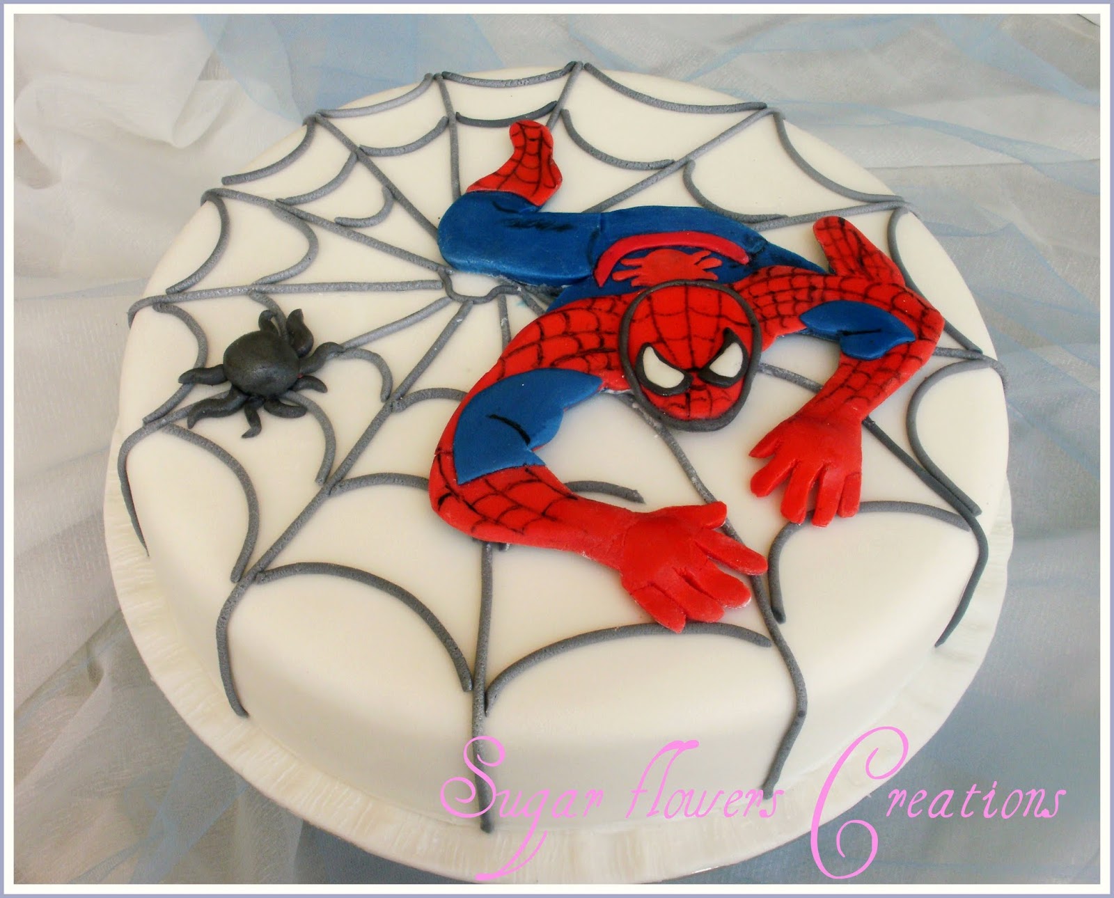 Για το στολισμό , λευκή ζαχαρόπαστα στολισμένη με φιγούρα Spiderman και αράχνη επίσης απο ζαχαρόπαστα.