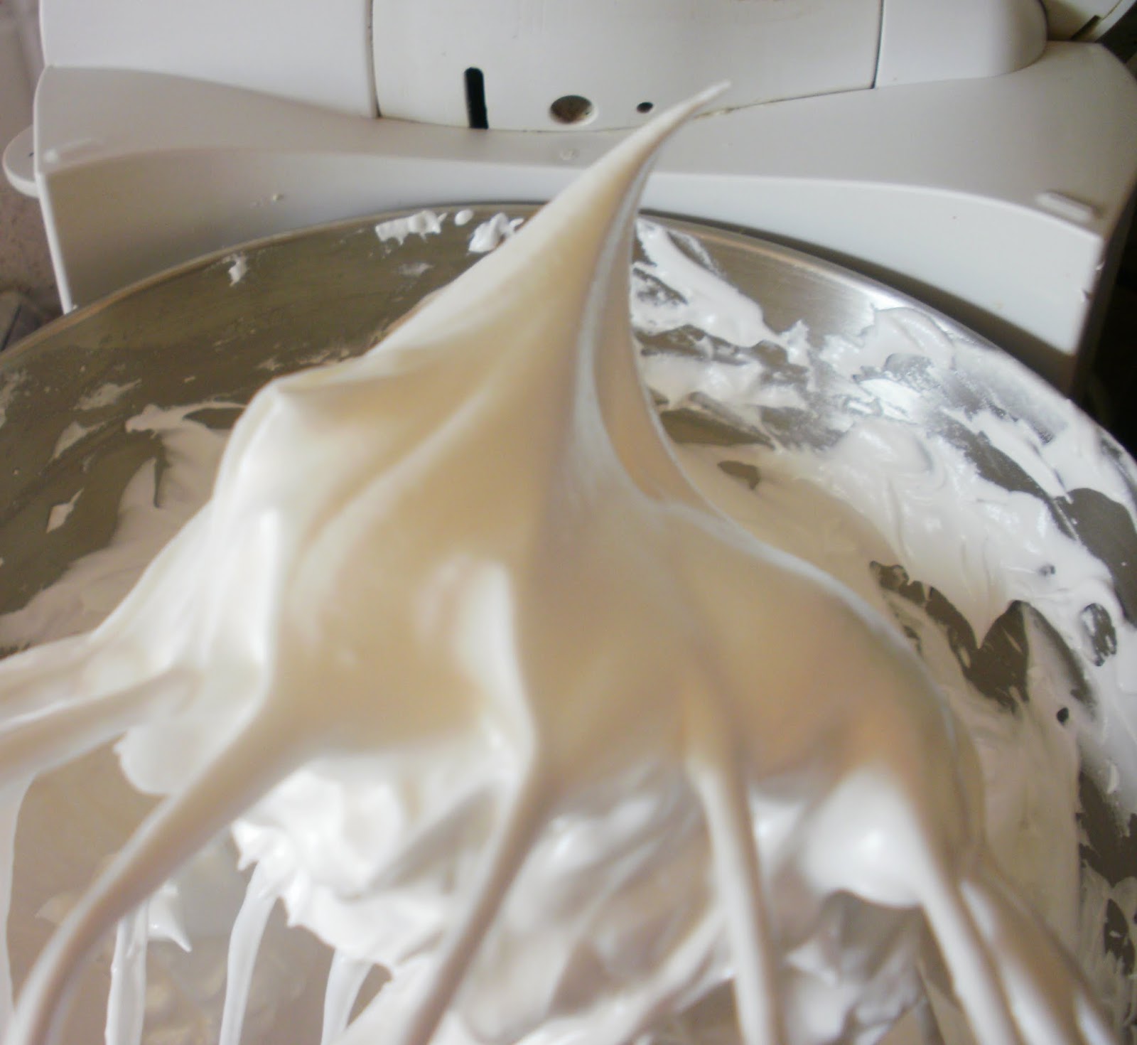 κλωστή πάνω στη μαρέγκα ( Να μην πέφτει στα τοιχώματα του μίξερ ή στο σύρμα γιατί θα κάνει κρυστάλλους) Συνεχίζουμε το χτύπημα για 10 λεπτά περίπου.μέχρι να κρυώσει και να γίνει σφιχτή μαρέγκα ( Αγκαλιάστε με τις παλάμες τον κάδο για να δείτε άν έχει κρυώσει )