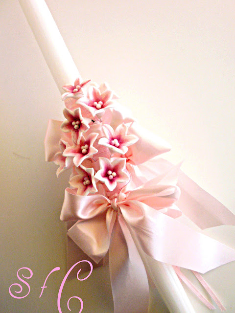 Λαμπάδα με ρόζ κορδέλες και λουλούδια με ρομαντική διάθεση.